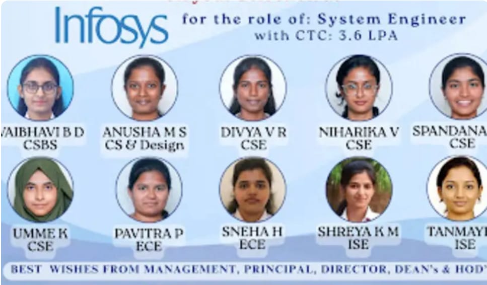 ಇನ್ಫೋಸಿಸ್ ಆಯ್ಕೆಯಾದ ಪ್ರಮುಖ ವಿದ್ಯಾರ್ಥಿಗಳು: ಕಂಪ್ಯೂಟರ್ ಸೈನ್ಸ್: ವಿ. ನಿಹಾರಿಕಾ, ಕೆ. ಆರ್. ಸ್ಪಂದನ, ಕೆ. ಉಮ್ಮೆ ಕಂಪ್ಯೂಟರ್ ಸೈನ್ಸ್ ಡಿಸೈನ್: ಎಂ ಎಸ್. ಅನುಷ ಕಂಪ್ಯೂಟರ್ ಸೈನ್ಸ್ ಬಿಸಿನೆಸ್ ಸಿಸ್ಟಮ್: ಬಿ ಡಿ. ವೈಭವಿ ಎಲೆಕ್ಟ್ರಾನಿಕ್ಸ್: ಪಿ. ಪವಿತ್ರ, ಎಚ್‌. ಸ್ನೇಹ ಮಾಹಿತಿ ಮತ್ತು ತಂತ್ರಜ್ಞಾನ: ಕೆ ಎಂ ಶ್ರೇಯಾ, ಬಿ. ತನ್ಮಯಿ ಇದೇ ತಿಂಗಳಲ್ಲಿ ನಡೆದ ಇತರ ಕಂಪನಿಗಳ ಕ್ಯಾಂಪಸ್ ಸಂದರ್ಶನಗಳಲ್ಲಿ ವಿದ್ಯಾರ್ಥಿಗಳು ಉತ್ತಮ ವೇತನದೊಂದಿಗೆ ಆಯ್ಕೆಯಾಗಿದ್ದಾರೆ. ಪ್ರೇರಣಾ ಇಂಜಿನಿಯರಿಂಗ್‌ ವರ್ಕ್ಸ್: ಎಲೆಕ್ಟ್ರಾನಿಕ್ಸ್ ವಿಭಾಗದ ಬಿ ಎಸ್ ಅಶ್ವಥ್ ಮತ್ತು ಎಸ್‌ ಕೆ. ದರ್ಶನ್ (₹5–7 ಲಕ್ಷ ವಾರ್ಷಿಕ), ಕಂಪ್ಯೂಟರ್ ಸೈನ್ಸ್ ವಿಭಾಗದ ಅದರ್ಶ್ ಕುಮಾರ್ (₹4.5 ಲಕ್ಷ ವಾರ್ಷಿಕ) ಸೀನ್ಥೈಟ್‌ ಇಂಡಸ್ಟ್ರೀಸ್: ಕೆಮಿಕಲ್ ವಿಭಾಗದ ಪ್ರಚೇತ್ ಎನ್‌ ಜೆ ಮತ್ತು ಸಹನ ಎನ್‌ ಎಸ್‌ (₹4.0 ಲಕ್ಷ ವಾರ್ಷಿಕ) ಅಂಪ್ಕಸ್‌ ಸೈಬರ್, ಬೆಂಗಳೂರು: ಪಿ. ಪಾವನಿ ಮತ್ತು ಎಸ್‌ ಎಸ್‌ ಮನೋಹರಿ (₹4.5 ಲಕ್ಷ ವಾರ್ಷಿಕ) ಐವ್ಯಾಂಟ್‌ ಸಂಸ್ಥೆ: ಕಂಪ್ಯೂಟರ್ ಸೈನ್ಸ್: ಬಿ ಎಸ್ ಮೋನಿಕಾ, ಎಂ ಪಿ ತನುಶ್ರೀ; ಮಾಹಿತಿ ಮತ್ತು ತಂತ್ರಜ್ಞಾನ: ಕೆ. ಪವನ್‌ ರಾಜು (₹3.6–4.2 ಲಕ್ಷ ವಾರ್ಷಿಕ) ಕ್ಯಾಂಪಸ್ ಸಂದರ್ಶನದಲ್ಲಿ ಆಯ್ಕೆಯಾದ ವಿದ್ಯಾರ್ಥಿಗಳ ಪರಿಶ್ರಮ ಮತ್ತು ಸಾಧನೆಗಾಗಿ ಕಾಲೇಜಿನ ಪ್ರಾಂಶುಪಾಲರು ಡಾ. ಎಚ್‌ ಬಿ ಅರವಿಂದ್, ನಿರ್ದೇಶಕರು ಪ್ರೊ. ವೈ ವೃಷಭೇಂದ್ರಪ್ಪ ಹಾಗೂ ತರಬೇತಿ ಮತ್ತು ಉದ್ಯೋಗ ವಿಭಾಗದ ಮುಖ್ಯಸ್ಥೆ ಸಿ ಆರ್‌ ನಿರ್ಮಲ ಅವರು ಹಾರೈಸಿದ್ದಾರೆ.